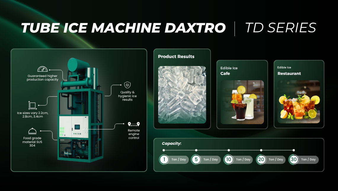 Selain mengejar hasil, Mesin Es Kristal (Tube) DAXTRO juga memudahkan operasional karena sistemnya dibuat efisien dan lebih mudah dirawat. Kamu bisa menjalankan produksi lebih terukur, mengurangi potensi downtime, dan menjaga kualitas es tetap konsisten dari batch ke batch. DAXTRO juga cocok untuk rencana pengembangan usaha karena tersedia pilihan kapasitas untuk kebutuhan komersial sampai skala pabrik, sehingga bisnis bisa tumbuh tanpa harus ganti sistem dari awal.